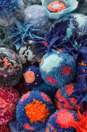 Ses œuvres – fleurs, pompons, stèles, tableaux, couronnes monumentales – traduisent une accumulation patiente, une douceur qui enveloppe sans écraser. Inspirée par la nature et les paysages imaginaires du Fukai de Miyazaki, elle façonne des sanctuaires textiles où chaque élément participe à une mélodie visuelle, entre densité et légèreté.